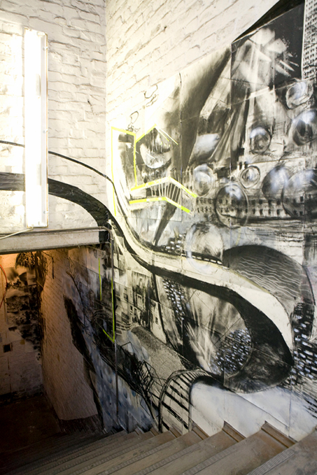 Flughafenstr.46, 2.HH.Treppenhaus, 1.TeilMischtechnik auf Papier und Backstein, 2010 |