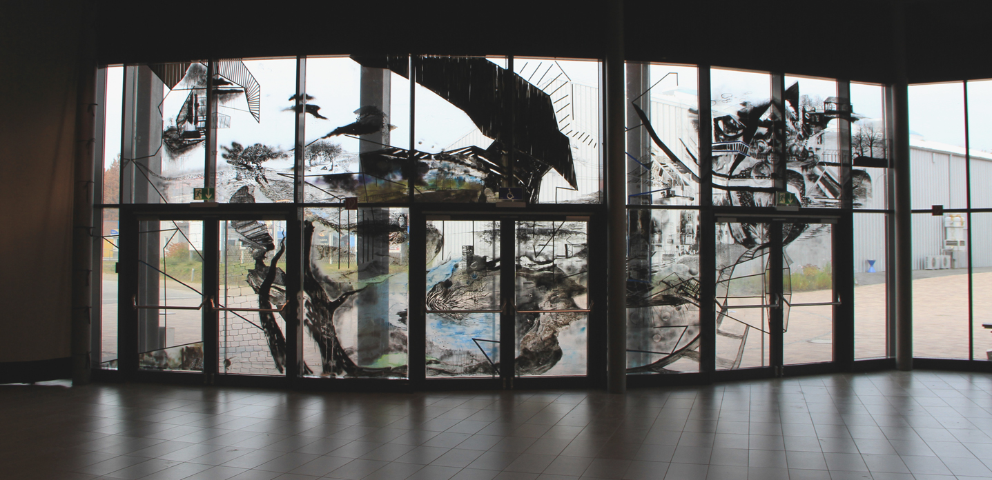 Glasfassade der Metropolis Halle, Potsdam Babelsberg, Ansicht bei Tag, Mischtechnik auf Folie, 2010