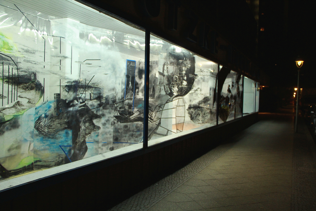 Raumarbeit im SCHAU FENSTER, Ansicht bei Nacht von Außen, Mischtechnik auf Folie, 2011