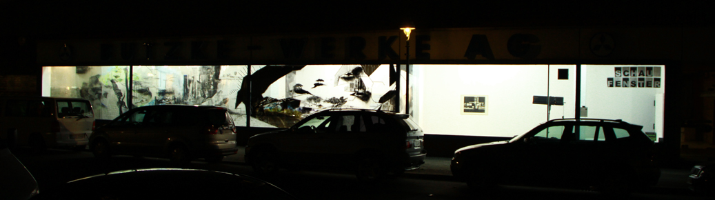 Raumarbeit im SCHAU FENSTER, Ansicht bei Nacht von Außen, Mischtechnik auf Folie, 2011
