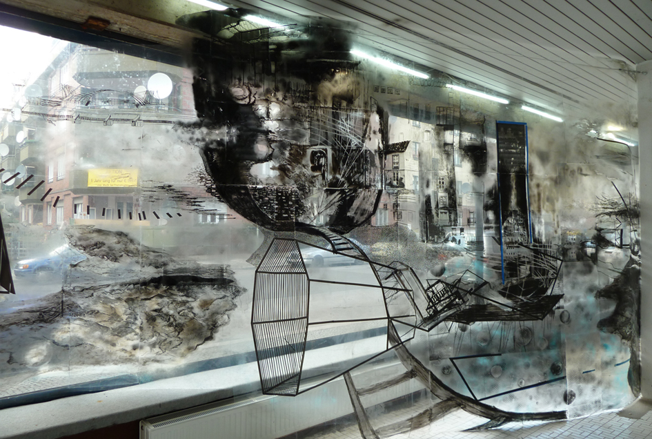 INSITE OUTRaumarbeit im SCHAU FENSTER, Ansicht von Innen bei Tag, Mischtechnik auf Folie, 2011 |